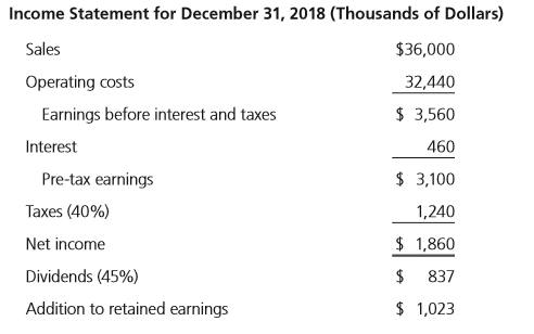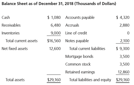 Balance Sheet as of December 31, 2018 (Thousands of Dollars) Cash $ 1,080 Accounts payable $ 4,320 Receivables 6,480 Accruals 2,880 Inventories 9,000 Line of credit Total current assets $16,560 Notes payable 2,100 Net fixed assets 12,600 Total current liabilities $ 9,300 Mortgage bonds 3,500 Common stock 3,500 Retained earnings 12,860 Total assets $29,160 Total liabilities and equity $29,160 Income Statement for December 31, 2018 (Thousands of Dollars) Sales $36,000 Operating costs 32,440 Earnings before interest and taxes $ 3,560 Interest 460 Pre-tax earnings $ 3,100 Taxes (40%) 1,240 Net income $ 1,860 Dividends (45%) $ 837 Addition to retained earnings $ 1,023