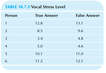 TABLE 10.7.5 Vocal Stress Level Person True Answer False Answer 1 12.8 13.1 2 8.5 9.6 3.4 4.8 5.0 4.6 10.1 11.0 11.2 12.1