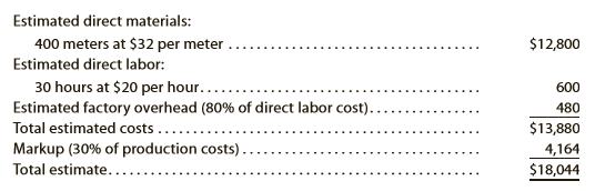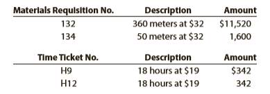 Estimated direct materials: 400 meters at $32 per meter $12,800 Estimated direct labor: 30 hours at $20 per hour...... Estimated factory overhead (80% of direct labor cost). Total estimated costs ... Markup (30% of production costs). 600 480 $13,880 4,164 Total estimate... $18,044 Materlals Requlsition No. Description 360 meters at $32 $11,520 Amount 132 134 50 meters at $32 1,600 TIme Ticket No. Description Amount H9 18 hours at $19 $342 H12 18 hours at $19 342
