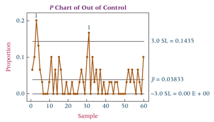 Study the Minitab ( chart for a manufactured item. The chart represents the results of testing 30 items at a time for compliance. Sixty different samples were taken for this chart. Discuss the results and the implications for the production process.