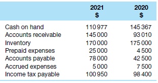 Cash on hand Accounts receivable Inventory Prepaid expenses Accounts payable Accrued expenses Income tax payable 2021 $ 110977 145 000 170 000 25 000 78 000 5000 100 950 2020 $ 145 367 93 010 175 000 4 500 500 500 42 7 98 400