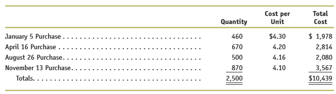 Cost per Unit Total Quantity Cost January 5 Purchase... 460 $4.30 $ 1,978 April 16 Purchase . 670 4.20 2,814 August 26 Purchase.. 500 4.16 2,080 November 13 Purchase. 870 3,567 $10,439 4.10 Totals... 2,500