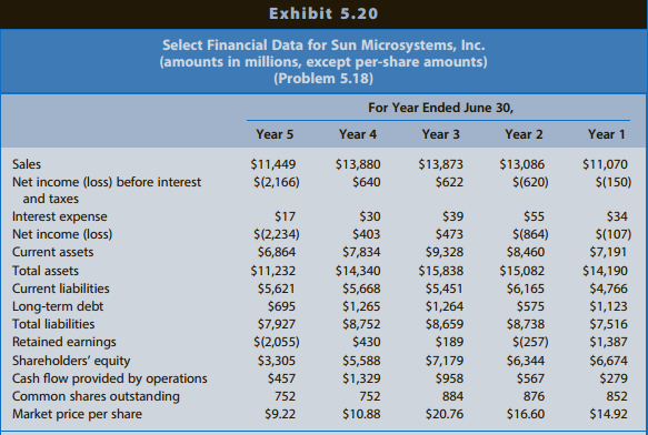 Exhibit 5.20 Select Financial Data for Sun Microsystems, Inc. (amounts in millions, except per-share amounts) (Problem 5.18) For Year Ended June 30, Year 5 Year 4 Year 3 Year 2 Year 1 Sales $11,449 $(2,166) $13,880 $13,873 $13,086 $(620) $11,070 $(150) Net income (loss) before interest $640 $622 and taxes Interest expense $17 $30 $39 $55 $34 Net income (loss) $(2,234) $403 $473 $(864) $(107) Current assets $6,864 $7,834 $9,328 $8,460 $7,191 $15,838 $5,451 Total assets $11,232 $14,340 $15,082 $14,190 Current liabilities $5,621 $5,668 $1,265 $8,752 $6,165 $4,766 Long-term debt Total liabilities $695 $1,264 $575 $1,123 $7,927 $(2,055) $8,659 $8,738 $7,516 Retained earnings Shareholders' equity Cash flow provided by operations Common shares outstanding Market price per share $430 $189 $(257) $1,387 $3,305 $5,588 $1,329 $7,179 $6,344 $6,674 $457 $958 $567 $279 752 752 884 876 852 $9.22 $10.88 $20.76 $16.60 $14.92