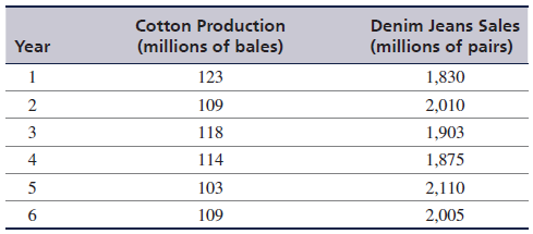 Suntrek is a global manufacturer and supplier of denim jeans to apparel retailers around the world. It purchases baled cotton around the world, ships it to its denim fabric factories, then to its denim jeans manufacturing facilities. Its cotton purchases and manufacturing and shipping plans depend on an accurate forecast of denim jeans demand. Suntrek believes there might be a strong relation- ship between cotton production and denim jeans demand, which will enable them to include cotton production as part of its forecasting process. Following are global cotton production and denim jeans sales for the past 6 years.