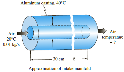 > The intake manifold of an automobile engine is approximated in the figure as a 4-cm-ID tube, 30 cm in length. Air at a bulk temperature of 20°C enters the manifold at a flow rate of 0.01 kg/s. The manifold is a heavy aluminum casting and is at a uniform