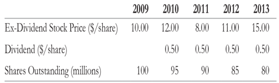 Suppose B&E Press paid dividends at the end of each year according to the schedule below. It also reduced its share count by repurchasing 5 million shares at the end of each year at the ex-dividend stock prices shown. (Assume perfect capital markets.)