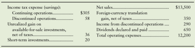 Net sales. $13,500 Income tax expense (savings): Continuing operations. . Discontinued operations.. Unrealized gain on available-for-sale investments, net of taxes.. Short-term investments.. . $305 Foreign-currency translation gain, net of taxes... Income from discontinued operations .. Dividends declared and paid . 36 58 350 290 650 Total operating expenses.... 20 12,200
