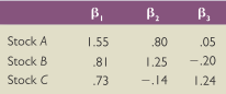 R, = R, + B,F, + B,F, – B,F, 3 B, Stock A 1.55 .80 .05 Stock B .81 1.25 -.20 Stock C .73 -.14 1.24