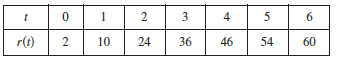 Suppose that a volcano is erupting and readings of the rate r (t) at which solid materials are spewed into the atmosphere are given in the table. The time is measured in seconds and the units for r (t) are tonnes (metric tons) per second.