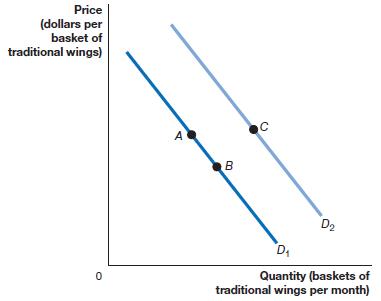 Suppose that the curves in the following graph represent two demand curves for traditional chicken wings (basket of six) at Buffalo Wild Wings. What would cause a movement from point A to point B on D1? Name two variables that if their values were to change would cause a movement from point A to point C.