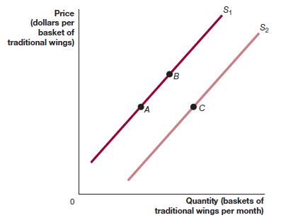 Suppose that the curves in the following graph represent two supply curves for traditional chicken wings (basket of six) at Buffalo Wild Wings. What would cause a movement from point A to point B on S1? Name two variables that if their values were to change would cause a movement from point A to point C.