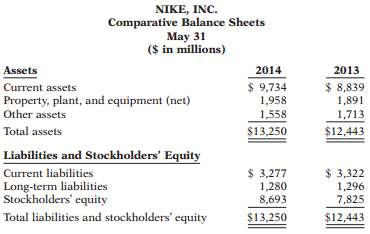 NIKE, INC. Comparative Balance Sheets May 31 ($ in millions) Assets 2014 2013 $ 9,734 1,958 1,558 $ 8,839 1,891 Current assets Property, plant, and equipment (net) Other assets 1,713 Total assets $13,250 $12,443 Liabilities and Stockholders' Equity Current liabilities Long-term liabilities Stockholders' Equity $ 3,277 1,280 $ 3,322 1,296 7,825 8,693 Total liabilities and stockholders' equity $13,250 $12,443