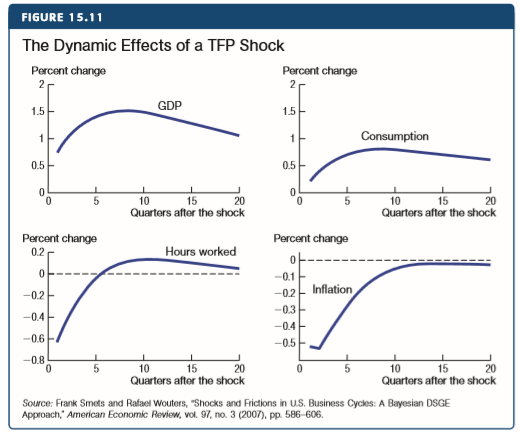 FIGURE 15.11 The Dynamic Effects of a TFP Shock Percent change Percent change 2 GDP 1.5- 1.5 1E Consumption 0.5 0.5 15 20 10 15 Quarters aftor the shock 20 10 Quarters after the shock Percent change 0.2 Percent change Hours worked -0.1 Inflation -0.2 -0.2 -0.3 -0.4E -0.4 -0.6 -0.5 -0.8 15 Quarters after the shock 10 10 20 15 Quarters after the shock 20 Source: Frank Smets and Rafael Wouters, "Shocks and Frictions in US. Business Cyckes: A Bayesian DSGE Approach," American Economic Review, vol. 97, no. 3 (2007), pp. 586-606.