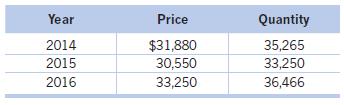 Year Price Quantity $31,880 30,550 35,265 33,250 2014 2015 2016 33,250 36,466