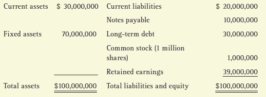 Current Assets $ 30,000,000 Current liabilities $ 20,000,000 Notes payable 10,000,000 Fixed assets 70,000,000 Long-term debt 30,000,000 Common stock (1 million shares) 1,000,000 Retained earnings 39,000,000 Total assets $100,000,000 Total liabilities and equity $100,000,000