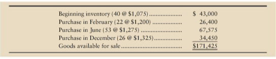 $ 43,000 Beginning inventory (40 @ $1,075). Purchase in February (22 @ $1,200) Purchase in June (53 @ $1,275) Purchase in December (26 @ $1,325) ................ 26,400 67,575 34,450 $171,425 Goods available for sale.