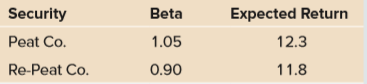 Security Beta Expected Return Peat Co. 1.05 12.3 Re-Peat Co. 0.90 11.8