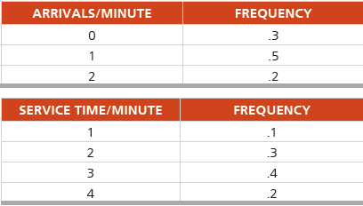 > The time between arrivals at the drive-through window of Barry Harmon’s fast-food restaurant follows the distribution given in the table. The service-time distribution is also given. Use the random numbers provided to simulate the activ