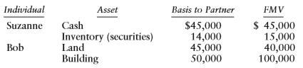 Individual Asset Basis to Partner FMV $ 45,000 15,000 40,000 100,000 Cash $45,000 14,000 45,000 50,000 Suzanne Inventory (securities) Land Bob Building