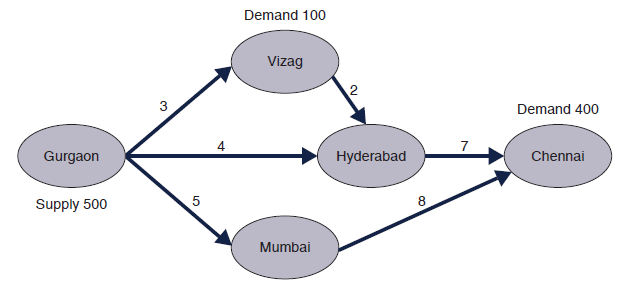 Suzuki Motors has manufactured 500 cars. These cars are to be transported to its customers in Vizag and Chennai. Four hundred cars are ordered from Chennai and hundred from Vizag. The vehicles traveling to Chennai take three routes as depicted in the figure. The number above each arrow represents the cost (in thousands of rupees) necessary to transport one car from origin city to destination city. The company wants to minimize its cost selecting the routes.