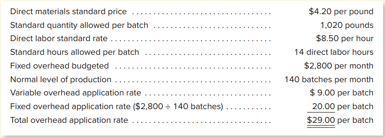 Sven Enterprises is a large producer of gourmet pet food. During April, it produced 147 batches of puppy meal. Each batch weighs 1,000 pounds. To produce this quantity of output, the company purchased and used 148,450 pounds of direct materials at a cost of $593,800. It also incurred direct labor costs of $17,600 for the 2,200 hours worked by employees on the puppy meal crew. Manufacturing overhead incurred at the puppy meal plant during April totaled $3,625, of which $2,450 was considered fixed. Svenâs standard cost information for 1,000-pound batches of puppy meal is as follows.