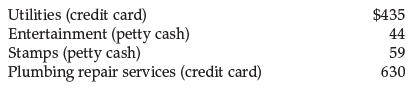 T. L. Jones Trucking Services establishes a petty cash fund on April 3 for $200. By the end of April, the fund has a cash balance of $97. The company has also issued a credit card and authorized its office manager to make purchases. Expenditures for the month include the following items: