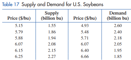 Table 17 contains priceâsupply data and priceâdemand data for soybeans. Find a linear regression model for the priceâsupply data where x is supply (in billions of bushels) and y is price (in dollars). Do the same for the priceâdemand data. (Round regression coefficients to two decimal places.) Find the equilibrium price for soybeans.