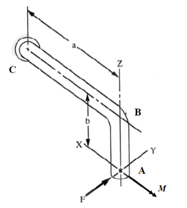 For the figure below, determine the deflection of point A on the angled rod in the Y direction due the applied load F and moment M. For deflection equations use table 5.1 in the text (both editions), Appendix D also has an extended deflection table. Assume that the rod has a solid circular cross-sectional area and that the mass of the rod is negligible.