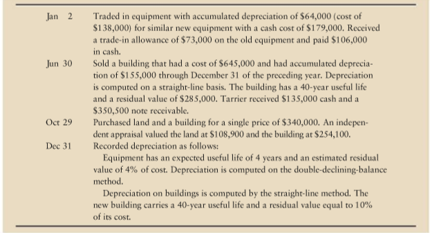 Jan 2 Traded in equipment with accumulated depreciation of $64,000 (cost of $138,000) for similar new equipment with a cash cost of $179,000. Received a trade-in allowance of $73,000 on the old equipment and paid $106,000 in cash. Sold a building that had a cost of $645,000 and had accumulated deprecia- tion of $155,000 through December 31 of the preceding year. Depreciation is computed on a straight-line basis. The building has a 40-year useful life and a residual value of $285,000. Tarrier received $135,000 cash and a Jun 30 $350,500 note receivable. Oct 29 Purchased land and a building for a single price of $340,000. An indepen- dent appraisal valued the land at $108,900 and the building at $254,100. Recorded depreciation as follows: Equipment has an expected useful life of 4 years and an estimated residual value of 4% of cost. Depreciation is computed on the double-declining-balance method. Depreciation on buildings is computed by the straight-line method. The new building carries a 40-year useful life and a residual value equal to 10% of its cost. Dec 31