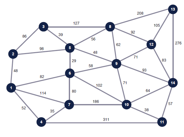 > Etisalat provides e-life home entertainment services to residents of Dubai through high-speed underground cables. Assume that the current network shows the distance between neighborhoods in kilometers. Find out the optimum length of cables required to co