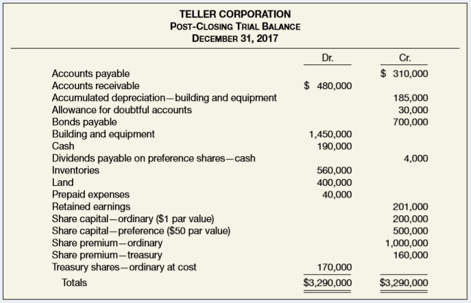 TELLER CORPORATION POST-CLOSING TRIAL BALANCE DECEMBER 31, 2017 Dr. Cr. $ 310,000 Accounts payable Accounts receivable Accumulated depreciation-building and equipment Allowance for doubtful accounts $ 480,000 185,000 30,000 700,000 Bonds payable Building and equipment Cash 1,450,000 190,000 Dividends payable on preference shares-cash Inventories 4,000 560,000 400,000 40,000 Land Prepaid expenses Retained earnings Share capital-ordinary ($1 par value) Share capital-preference ($50 par value) Share premium-ordinary Share premium-treasury Treasury shares-ordinary at cost 201,000 200,000 500,000 1,000,000 160,000 170,000 Totals $3,290,000 $3,290,000 Ordinary Preference Authorized 600,000 200,000 190,000 60,000 10,000 10,000 Issued Outstanding