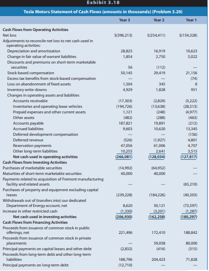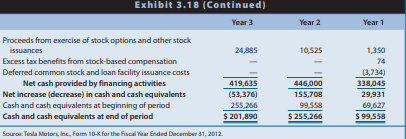 Tesla Motors Manufactures high-performance electric vehicles that are extremely slick looking. Exhibit 3.18 presents the statement of cash flows for Tesla Motors for Year 1 through Year 3.