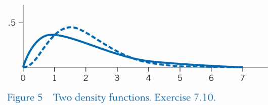 > The population density function and that for the sampling distribution of X, for n = 2, are shown in Figure 6. Identify which one is the sampling distribution and explain your answer.