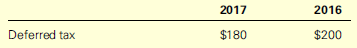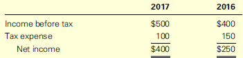 2017 2016 Deferred tax $180 $200 2017 2016 Income before tax $500 $400 Tax expense 100 150 Net income $400 $250