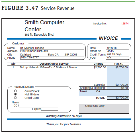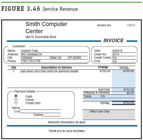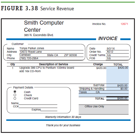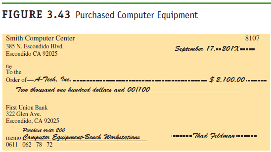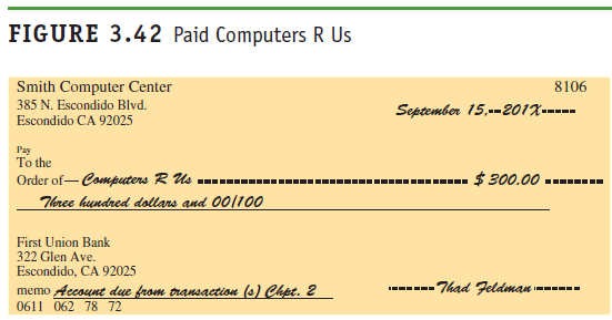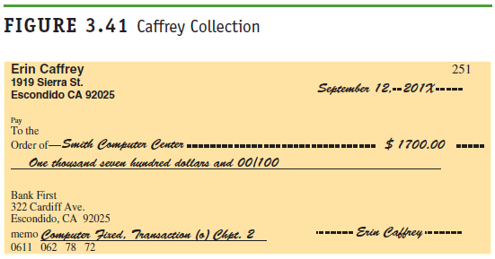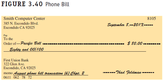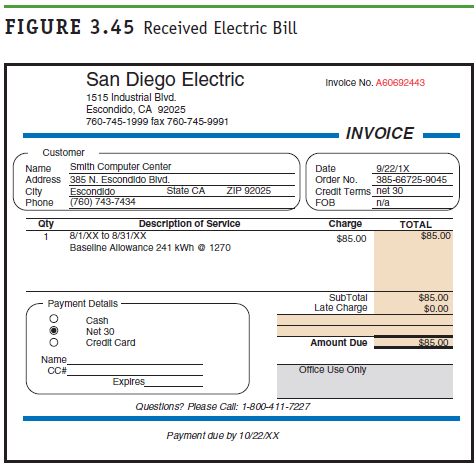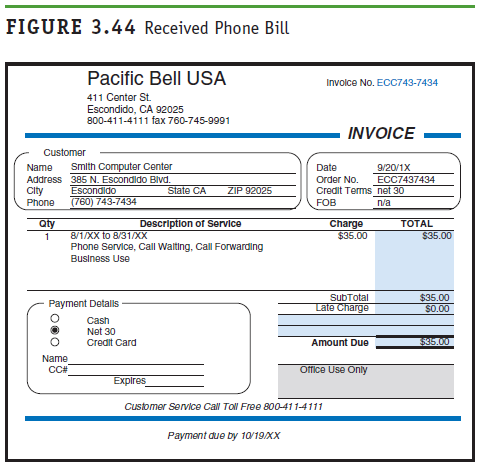 Smith Computer Center 8104 385 N. Escondido Blvd. September 1,-201X-- ----- -- Escondido CA 92025 Pay To the Order of-Chapin Corp. One thousand five hundred and 00|100 $ 1500.0o ----------- ------ -------- - --- -- First Union Bank 322 Glen Ave. Escondido, CA 92025 memo Prepaid RentAug. Sept. Oct.* -Thad Feldman 0611 062 78 72 FIGURE 3.38 Service Revenue Smith Computer Center Involce No. 12671 385 N. Escondido Blvd. INVOICE Customer Tonya Parker Jones Name Address 12672 Royal Lane City Phone Date 9/2/1X A512 Credit Terms na na Order No. Carlsbad State CA ZIP 92008 (760) 720-2954 FOB Qty 1 Description of Service Upgrade 386 CPU to Pentlum 133mhz board Charge $420.00 TOTAL $420.00 add 16x CD-Rom SubTotal $420.00 $0.00 Payment Detalls Shipping & Handling Тахes Cash CA Check Credit Card TOTAL $420.00 Name Office Use Only Expires Warranty Information 30 days Thank you tor your business FIGURE 3.39 Service Revenue Smith Computer Involce No. 12672 Center 385 N. Escondido Blvd. INVOICE Customer LIlly Lite Address 1414 Genesis St. Carlsbad (760) 945-1212 Name Date 9/6/1X Order No. A513 City Phone State CA ZIP 92008 Credit Terms_n/a FOB va Description of Service Upgrade Ram to 4-72pin Ram 64mb ТOTAL $150.00 Qty Charge $150.00 1 SubTotal Shipping & Handlng CA $150.00 Payment Detalls $0.00 Cash Taxes Check Credit Card TOTAL $150.00 Name C#, Office Use Only Expires Warranty Information 30 days ank you for your business FIGURE 3.40 Phone Bill Smith Computer Center 8105 385 N. Escondido Blvd. September 8,--201X-- ---- Escondido CA 92025 Pay To the Order of-Pacifie Bell - ----- ---- $ 80.00 ..--- --- Eighty and 001100 First Union Bank 322 Glen Ave. Escondido, CA 92025 memo August phone bill transaction (k) Chpt. 2 0611 062 78 72 Thad Feldman II--- -- I-----. FIGURE 3.41 Caffrey Collection Erin Caffrey 1919 Slerra St. 251 September 12,--201X--- Escondido CA 92025 Pay To the Order of-Smith Computer Center $ 1700.00 I-------------I--- ---- One thousand seven hundred dollars and 001100 Bank First 322 Cardiff Ave. Escondido, CA 92025 · Erin Caffrey memo Computer Fixed, Transaction (a) Chpt. 2 0611 062 78 72 I---- -- I---- -- FIGURE 3.42 Paid Computers R Us Smith Computer Center 8106 385 N. Escondido Blvd. September 15,--201X-- ---- Escondido CA 92025 Pay To the Order of- Computers R Us ----- ------- $ 300.00 I --.. Tree hundred dollars and 001100 First Union Bank 322 Glen Ave. Escondido, CA 92025 Thad Feldman · memo Account due from transaction (s) Chpt. 2 0611 062 78 72 I---- -- I--- -- FIGURE 3.43 Purchased Computer Equipment Smith Computer Center 8107 385 N. Escondido Blvd. September 17, 201X----- Escondido CA 92025 Pay To the Order of-A-Tech, Ime. ------- $ 2,100.00. - ----I------------- I ---- Two thousand one hundred dollars and 00|100 First Union Bank 322 Glen Ave. Escondido, CA 92025 Purchase order 200 memo Computer Equipment-Bench Workstations 0611 062 78 72 Thad Feldman FIGURE 3.44 Received Phone Bill Pacific Bell USA Involce No. ECC743-7434 411 Center St. Escondido, CA 92025 800-411-4111 fax 760-745-9991 INVOICE Customer Name Smith Computer Center Date 9/20/1X Order No. Credit Terms net 30 Address 385 N. Escondido Blvd. ECC7437434 State CA City Phone Escondido ZIP 92025 (760) 743-7434 FOB n/a Description of Service TOTAL $35.00 Qty Charge $35.00 1 8/1/XX to 8/31//XX Phone Service, Call Walting, Call Forwarding Business Use SubTotal $35.00 Payment Detalls Late Charge $0.00 Cash Net 30 Credit Card Amount Due 535.00 Name CC# Office Use Only Explres Customer Service Call Tol Free 800-411-4111 Payment due by 10/19/XX FIGURE 3.45 Received Electric Bill San Diego Electric Involce No. A60692443 1515 Industrial Blvd. Escondido, CA 92025 760-745-1999 fax 760-745-9991 INVOICE Customer Smith Computer Center Address 385 N. Escondido Blvd. Escondido (760) 743-7434 9/22/1X 385-66725-9045 Name Date Order No. State CA ZIP 92025 City Phone Credit Terms_net 30 FOB n/a Description of Service TOTAL Qty 1 Charge 8/1/XX to 8/31/XX $85.00 $85.00 Basellne Allowance 241 KWh © 1270 SubTotal Payment Detalls $85.00 $0.00 Late Charge Cash Net 30 Credit Card Amount Due $85.00 Name CC# Office Use Only Explres Questions? Please Call: 1-800-411-7227 Payment due by 10/22/XX FIGURE 3.46 Service Revenue Smith Computer Involce No. 12673 Center 385 N. Escondido Blvd. INVOICE Customer Howard Trale Address 300 Carlsbad Dr. Carlsbad (760) 720-2199 Name Date 9/26/1X Order No. A514 City State CA ZIP 92008 Credit Terms na FOB Phone n/a Description of Service Charge aty add video card 2mb dram 64 dlamond stealth TOTAL 1 $750.00 $750.00 SubTotal Shipping & Handling СА $750.00 $0.00 Payment Detalls Cash Тахes Check Credit Card TOTAL $750.00 Name Office Use Only Explres Warranty Information 30 days Thank you for your business FIGURE 3.47 Service Revenue Smith Computer Involce No. 12674 Center 385 N. Escondido Blvd. INVOICE Customer Dr. Michael Turlono Address 229 Dlamond Rich Ave. Carlsbad (760) 729-2777 Date Order No. Name 9/28/1X A515 Credit Terms net 15 days n/a City Phone State CA ZIP 92008 FOB aty Description of Service Set up Network 10BaseT -10 Stations 1 Server Charge TOTAL $2,700.00 1 $2,700.00 $2,700.00 $0.00 SubTotal Payment Detalls Shipping & Handiling Cash/Check Тахes CA Net 15 days Credit Card TOTAL 52.700.00 Name Office Use Only Expires Warranty Intormation 30 days ank you your business