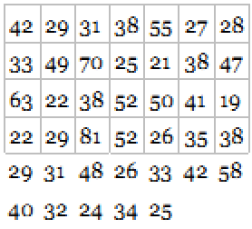 42 29 31 38 55 27 28 33 49 70 25 21 38 47 63 22 38 52 50 41 19 22 29 81 52 26 35 38 29 31 48 26 33 42 58 40 32 24 34 25