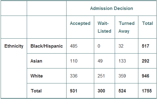 The A Chance magazine article described in Chapter 2, Exercise 37 further examined the impact of an applicant ethnicity on the likelihood of admission to the Houston Independent School District magnet schools programs. Those data are summarized in the table below: