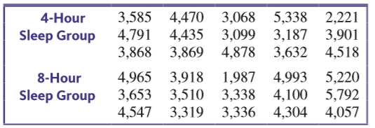 The accompanying data on food intake (in Kcal) for 15 men on the day following two nights of only 4 hours of sleep each night and for 15 men on the day following two nights of 8 hours of sleep each night are consistent with summary quantities in the paper âShort-term Sleep Loss Decreases physical activity Under free-Living conditions but Does not increase food intake Under time-Deprived Laboratory conditions in healthy menâ (American Journal of Clinical Nutrition [2009]: 1476â1482). The men participating in this experiment were randomly assigned to one of the two sleep conditions.