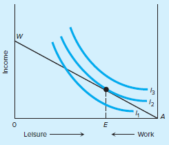 The accompanying diagram restates the basic workâleisure choice model presented in Chapter 2. Use this diagram to explain the declining workweek occurring in the preâWorld War II period, making explicit the assumptions underlying your analysis. We noted in the present chapter that the stability of the workweek in the postâWorld War II era has been attributed by various scholars to such considerations as