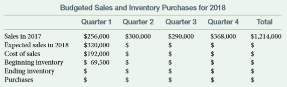 Budgeted Sales and Inventory Purchases for 2018 Quarter 1 Quarter 2 Quarter 3 Quarter 4 Total Sales in 2017 $256,000 $300,000 $290,000 $368,000 $1,214,000 Expected sales in 2018 Cost of sales $320,000 $ $192,000 $ $ 69,500 Beginning inventory Ending inventory $ $ Purchases $