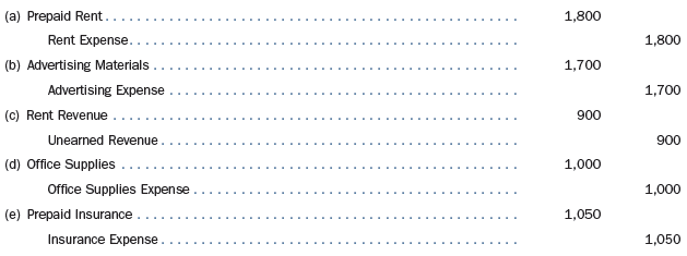 (a) Prepaid Rent.. 1,800 Rent Expense.. 1,800 (b) Advertising Materials 1,700 Advertising Expense 1,700 (c) Rent Revenue 900 Unearned Revenue. 900 (d) Office Supplies ... 1,000 Office Supplies Expense. 1,000 (e) Prepaid Insurance 1,050 Insurance Expense . 1,050