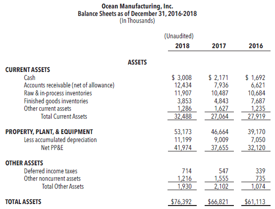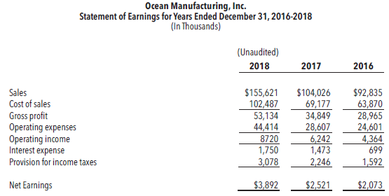 You acquired the past three years’ financial statements from Ocean, including the unaudited statements for the most recent year ended December 31, 2018.This financial information is provided on the pages that follow. The partner who will be in charge of the Ocean engagement, Jane Hunter, wants you to look them over to see what information you can draw from them, paying particular attention to items that might be helpful in determining whether or not to accept Ocean as a new audit client.