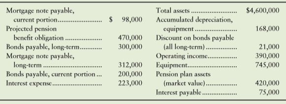 Total assets. Mortgage note payable, current portion.. Projected pension benefit obligation . Bonds payable, long-term. Mortgage note payable, long-term . Bonds payable, current portion... Interest expense. $4,600,000 $ 98,000 Accumulated depreciation, equipment. Discount on bonds payable (all long-term) . Operating income.. Equipment... Pension plan assets (market value). Interest payable. 168,000 470,000 300,000 21,000 390,000 745,000 312,000 200,000 223,000 420,000 75,000 .......