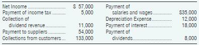 Payment of salaries and wages. Depreciation Expense. Payment of interest Payment of dividends. S 57,000 5,000 Net Income Payment of income tax Collection of S35,000 12,000 18,000 dividend revenue. 11,000 Payment to suppliers Collections from customers. 54,000 133,000 8,000