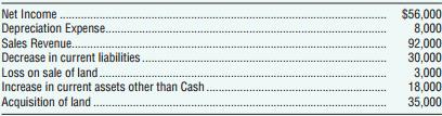 Net Income . Depreciation Expense. Sales Revenue. Decrease in current liabilities Loss on sale of land. . Increase in current assets other than Cash $56,000 8,000 92,000 30,000 3,000 18,000 35,000 Acquisition of land..