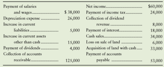 $60,000 Payment of salaries and wages.. Depreciation expense Net income.. $ 38,000 Payment of income tax. 26,000 Collection of dividend 24,000 Increase in current 8,000 revenue liabilities . 5,000 Payment of interest... 18,000 Increase in current assets Cash sales.. 34,000 other than cash.. 15,000 Loss on sale of land 4,000 Acquisition of land with cash... Payment of accounts payable 6,000 ........ Payment of dividends. Collection of accounts 33,000 receivable.. 125,000 53,000