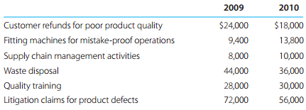 2009 2010 Customer refunds for poor product quality $24,000 $18,000 Fitting machines for mistake-proof operations 9,400 13,800 Supply chain management activities 8,000 10,000 Waste disposal 44,000 36,000 Quality training 28,000 30,000 Litigation claims for product defects 72,000 56,000