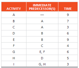 IMMEDIATE ACTIVITY PREDECESSOR(S) TIME A 9 B A 7 A 3 D B 6 E B 9 F 4 G Е, F 6 D 5 G, H m.