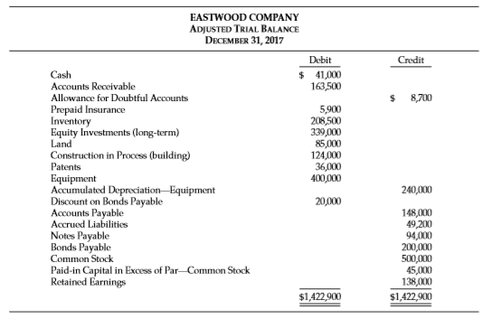 EASTWOOD COMPANY ADJUSTED TRIAL BAlanCE DECEMBER 31, 2017 Debit Credit Cash Accounts Receivable $ 41,000 163,500 Allowance for Doubtful Accounts 8,700 Prepaid Insurance Inventory Equity Investments (long-term) Land Construction in Process (building) Patents 5,900 208,500 339,000 85,000 124,000 36,000 400,000 Equipment Accumulated Depreciation-Equipment Discount on Bonds Payable Accounts Payable Accrued Liabilities Notes Payable Bonds Payable 240,000 20,000 148,000 49,200 94,000 200,000 500,000 45,000 138,000 Common Stock Paid-in Capital in Excess of Par-Common Stock Retained Earnings $1,422,900 $1,422,900
