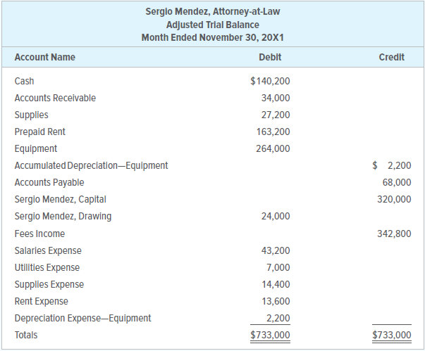 The adjusted trial balance of Sergio Mendez, Attorney-at-Law, as of November 30, 20X1, after the company had completed the first month of operations, appears below.
